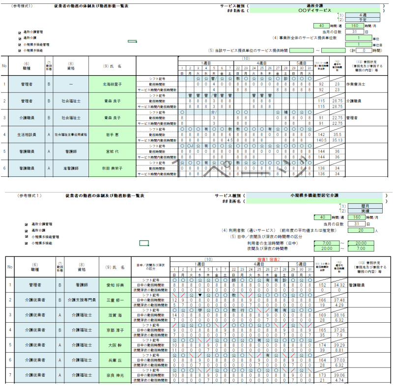 例えば「デイサービス」と「小規模多機能居宅介護」で「従業者の勤務の体制及び勤務形態一覧表」の種別が違う複合介護施設でも同じ勤務表で作成して別々の勤務形態一覧表に出力できます(他の組合せでも作成可能です)